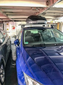 Nun wurde ich erneut gerufen mit "Lady!" und man wies mich an, mit dem Auto zur Rampe der Autofähre zu fahren. Pünktlich 9:30 Uhr durften wir auf die Fähre, die beiden Männer allerdings nur zu Fuß und ich mit dem Auto. Die Auffahrt auf die Fähre erfolgte rückwärts. „Are you a good driver?“ Fragte man mich. „Äh, ya.“ „Ok, it is important.“, und dann redeten zwei Herren auf mich ein, wie ich lenken und einparken sollte. Als mir das Auto ausging, weil ich über die Rampen rückwärts nicht genug Gas gab, schoben die zwei Männer kurzerhand das Auto in die Fähre rein. Das war mir ein bisschen peinlich. Es ist ja auch nett gemeint, aber beim Einparken, auch knapp auf Fähren, kann ich dieses auf mich einreden nicht so gut gebrauchen. Aber immerhin machten sie es dann mit den anderen vier einparkenden Autos genauso und es lag nicht an mir. Bis auf den Millimeter passte auch die Dachbox in den Laderaum, aber höher hätte diese nicht sein dürfen. Bullies oder Wohnmobile passen hier definitiv nicht rein. |