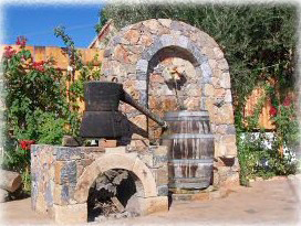 Esel Cora zieht die 130 Jahre alte Stein-Olivenpresse (Foto links). Außerdem gibt es eine selbstgebaute Steinwindmühle, einen Webstuhl zur Produktion heimischer Textilien und eine Traubenpresse zu sehen. In großen Steinkrügen werden die Oliven gesammelt. Ein Besuch hierher lohnt sich sehr! Der Besitzer dieses Bauernhofes, uncle-Manolis, versucht alles so gut es geht zu erklären und ist sehr nett zu seinen Besuchern. |